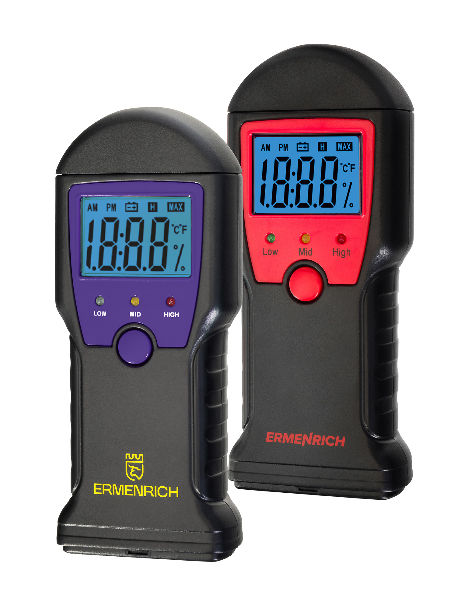 The Ermenrich Wett MW10 is a pin-type moisture detector for determining the moisture content of wood, construction mixtures and mortars. The device can also measure temperature in Celsius or Fahrenheit. Simple control with a single button. The measurements are displayed on the built-in screen with large digits and a bright blue backlight. Below the screen, there are three LED indicators that give an overall rating of how much moisture is in the material: green means low, yellow means increased, and red means high.